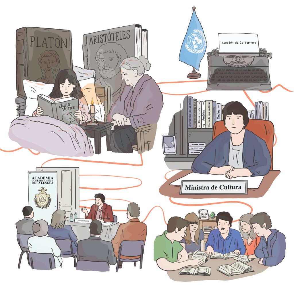 Carmen fue una mujer de vanguardia y transgresora. En un mundo donde los puestos de liderazgo eran solo para hombres, ella rompió todas las barreras. Fue la primera mujer en ser ministra de Cultura en Costa Rica. Además, trabajó incansablemente con UNICEF para proteger a la infancia y fue una líder fundamental en la creación de la Ley de Igualdad Real, luchando por los derechos de todas las mujeres costarricenses. También fue directora del Museo de Arte Costarricense.